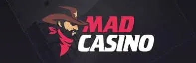 Logo Mad Casino en rouge et blanc sur fond noir avec un visage de cowboy